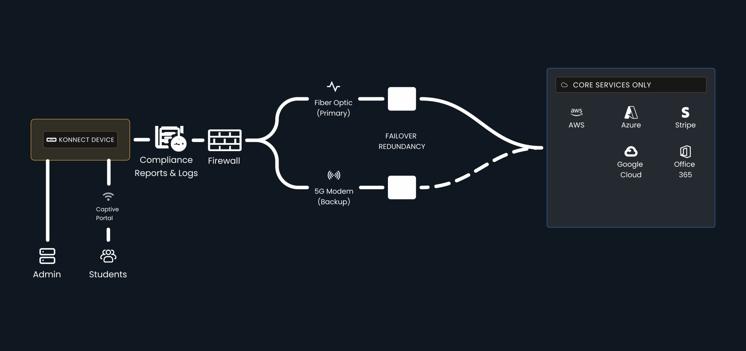 Reliable internet with instant failover, secure controlled access with individual usage attribution for regulatory compliance.